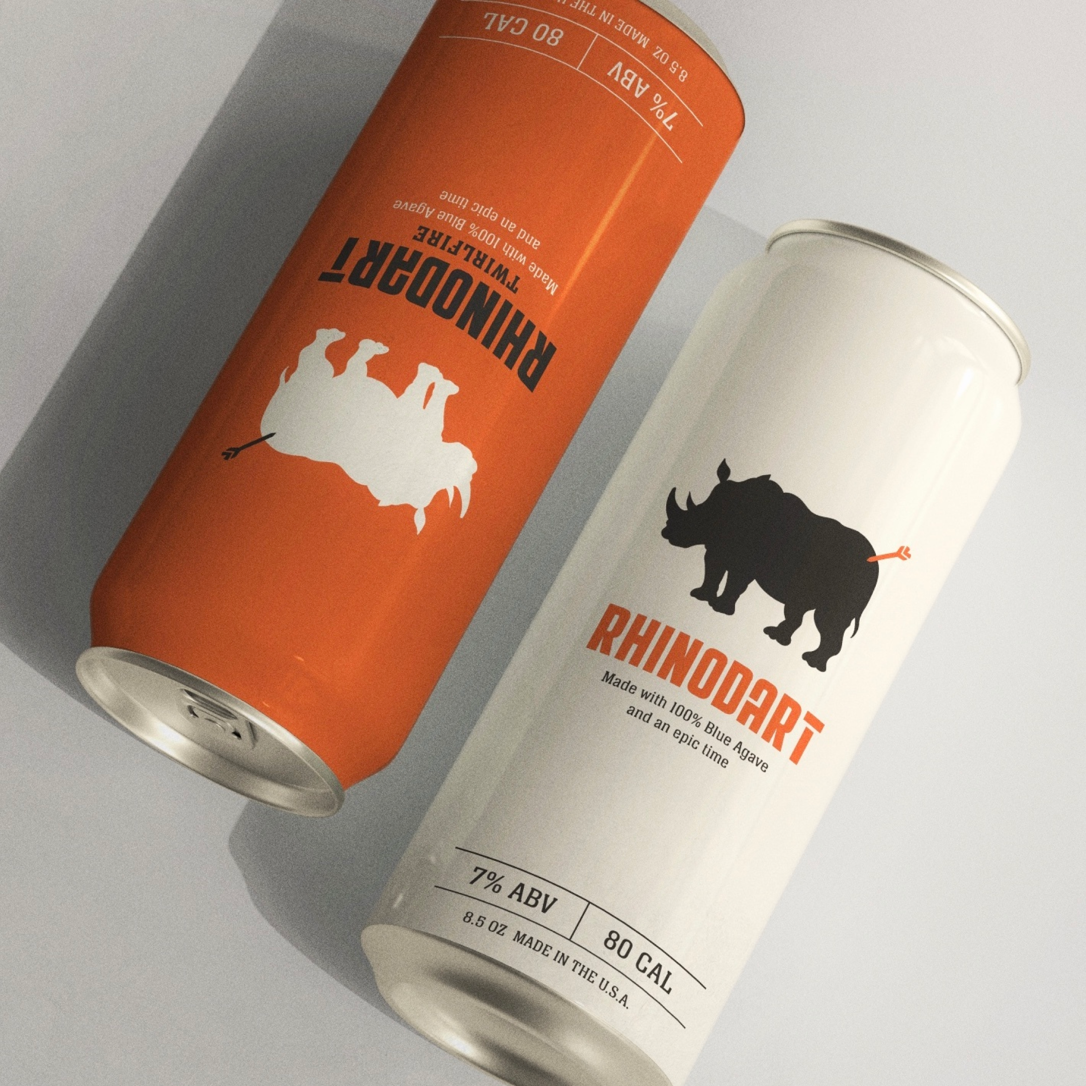 Social media graphics for Rhinodart, agave spirits, featuring proposed can designs, merch, and secondary animation.